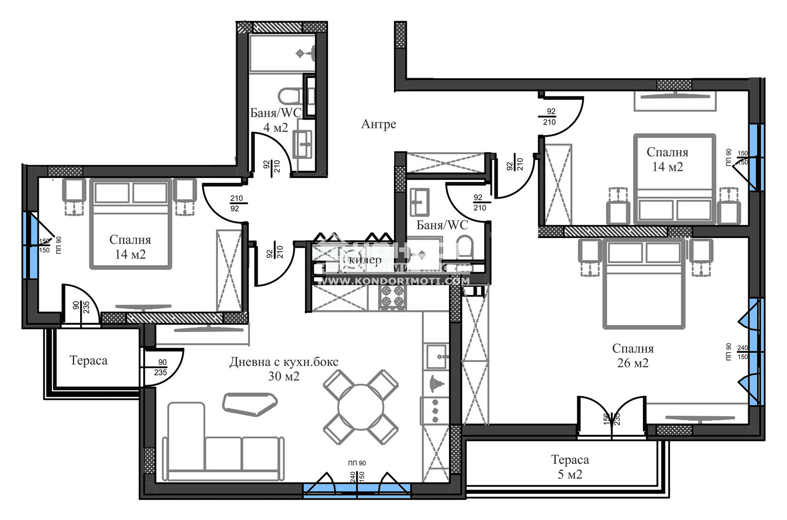 Оферта 67168: Специално предложение - СПЕЦИАЛНА ОФЕРТА !!! НОВА СГРАДА!!! НИСЪК ПРОЦЕНТ ОБЩИ ЧАСТИ! Разпределения - Предлагаме на Вашето внимание просторен и панорамен 4 - Стаен апартамент, състоящ се от ъглова дневна с трапезария и кухненски бокс - 30 м2 с излаз на тераса, просторна родителска спалня - 25.00кв.м. със собствена баня и излаз на тераса, две детски стаи с площ от 13.58кв.м. , втора баня с тоалетна , широко входно антре с килер , подходящ и за перално помещение. Материали - Проектирана с изключително нисък процент общи части, жилищната сграда се изгражда в унисон с най-високите европейски стандарти за качество. Използваните материали са съобразени с най-новите тенденции в строителството - модерна външна облицовка, покривна и фасадна изолация, PVC пет камерна дограма, луксозни общи части и др., допринасят допълнително за усещането за лукс и комфорт на обитателите. За удобството на своите собственици, сградата разполага подземен паркинг с Гаражи и Паркоместа, както и Паркоместа ситуирани в двора на цена от 7000 евро.