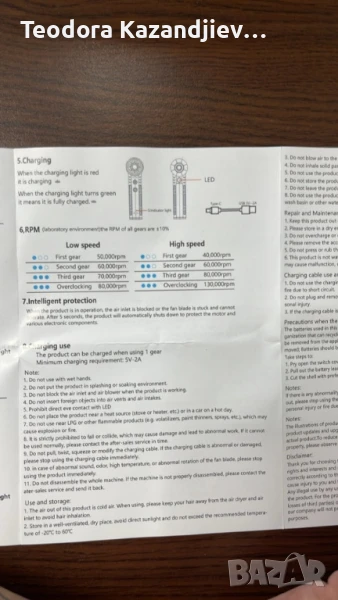 Мощност на двигателя: 130000 RPM (оборота в минута), осигуряващ силен въздушен поток;
