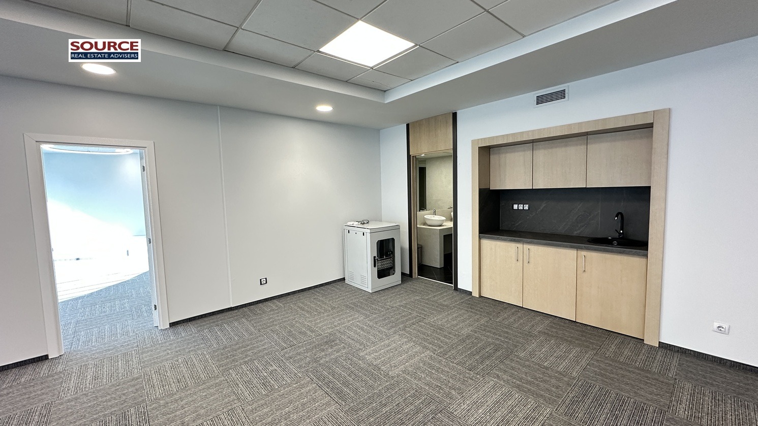 2. Разпределение: 1 голямо Open space помещение, 1 отделно работно помещение, оборудвана кухня, 3 wc Офисът може да бъде изцяло Open space или допълнително преграден според изискванията на Наемателя.