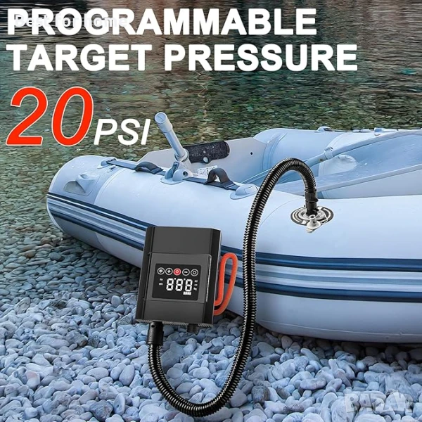 Интелигентна помпа за SUP с функция за автоматично изключване: Функцията за автоматично изключване изключва помпата, когато се достигне целевото налягане по време на напомпване, и по този начин предотвратява повреди на вашите SUP дъски, надуваеми предмети или други играчки за басейн.