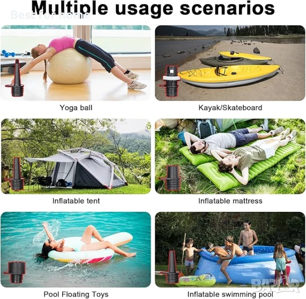 12v електрическа помпа за надуваеми: Електрическата помпа за гребло 20PSI с маркуч за въздух с дължина 3,54 фута (1,1 м) е оборудвана с 6 различни въздушни дюзи, подходящи за различни надуваеми продукти, като гребло, надуваеми матраци, басейни, палатки, каяци, топки за йога и др.