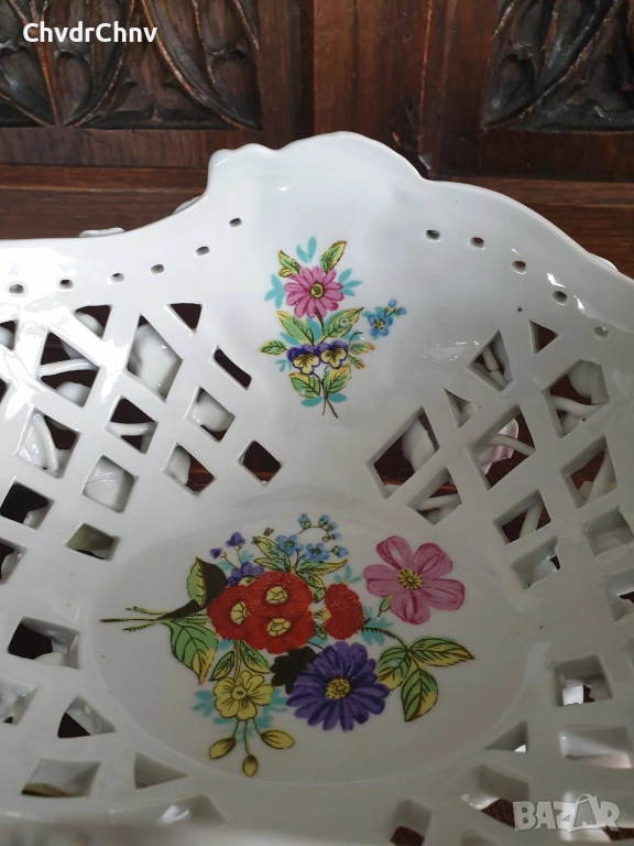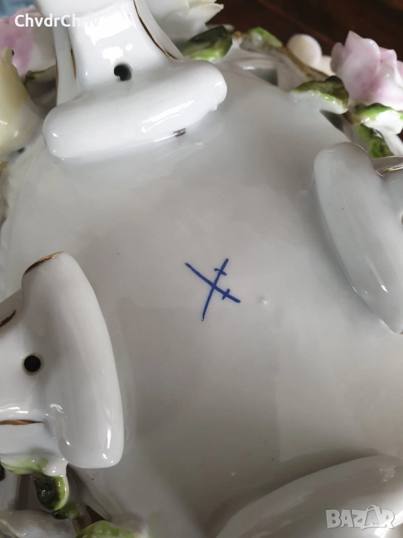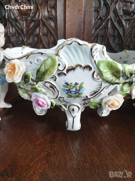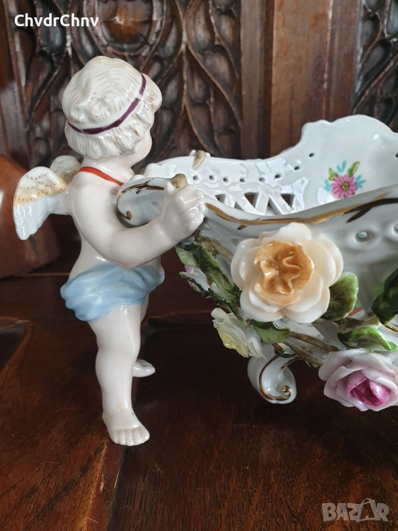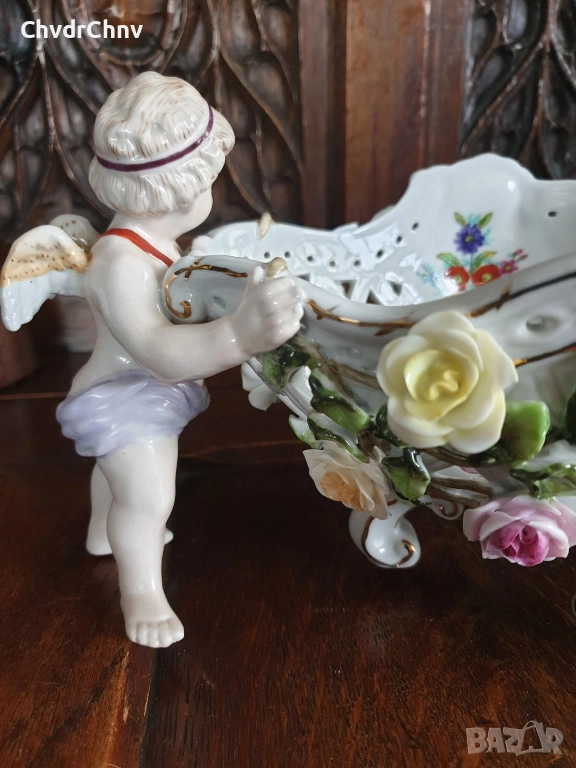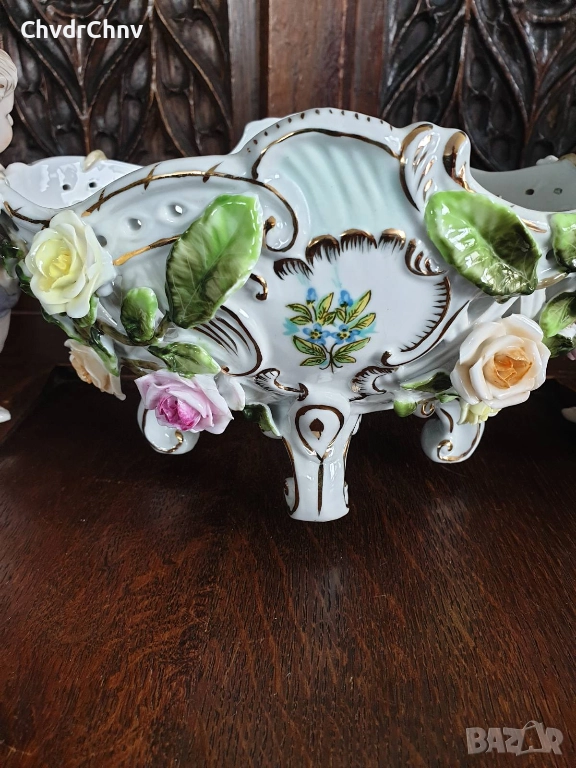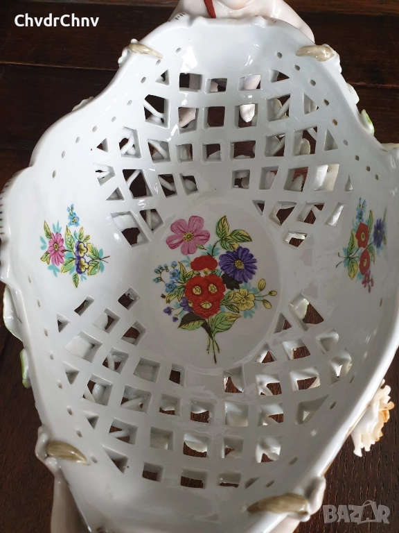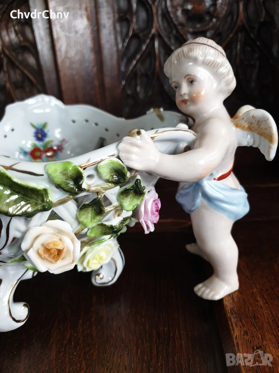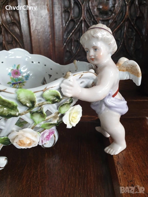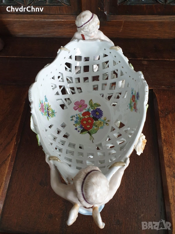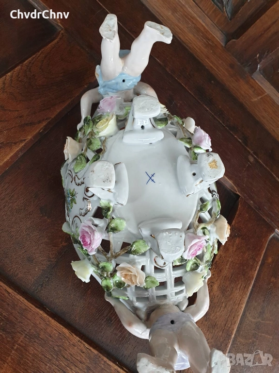 Meissen фигурална ажурна фруктиера 32см/стара Майсен порцеланова жардениера с херувими