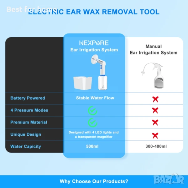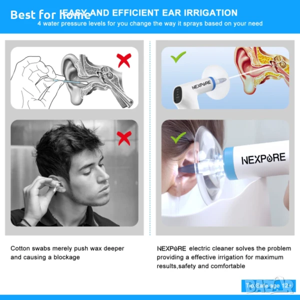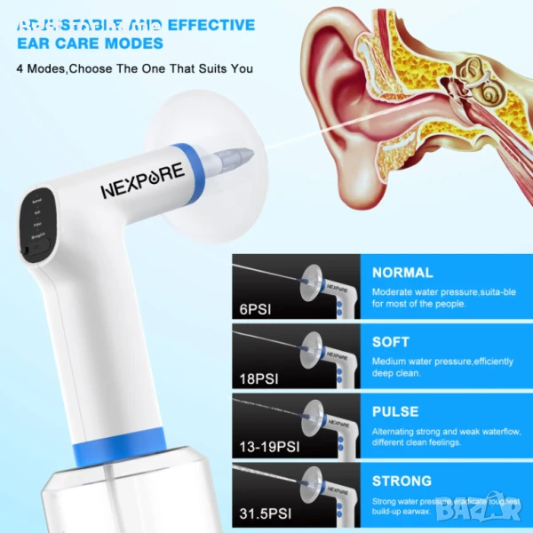 [Удобен и ефикасен комплект за почистване на уши] Електрическата система за напояване на уши NEXPURE осигурява безопасен, надежден и ефективен воден поток с 4 нива на водно налягане (6 - 31,5 PSI) за бързо премахване на запушвания от ушна кал, отломки и облекчаване на ушната кал у дома. Бързо и безопасно автоматично отстраняване на ушна кал от засегнатите уши, без неефективно промиване на ушите, по-ефективен комплект за почистване на уши.