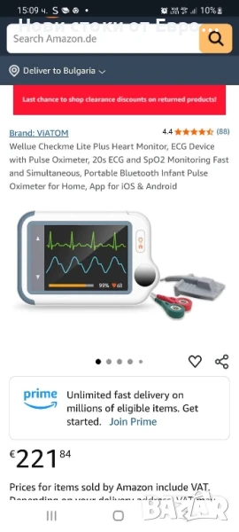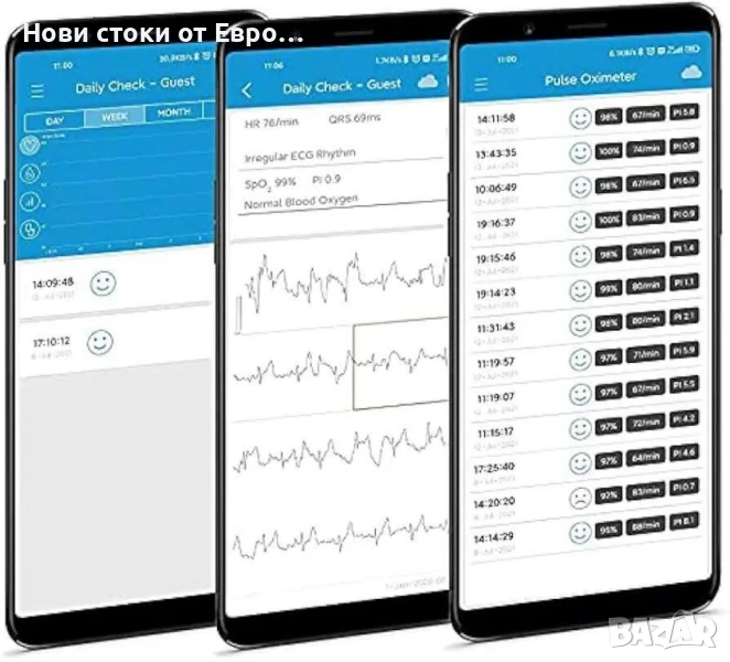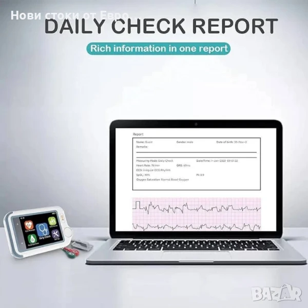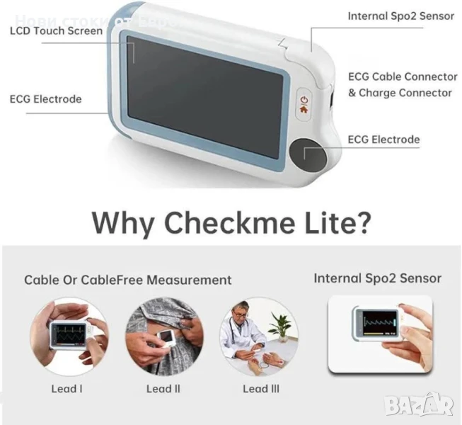 ЕКГ устройство с пулсов оксиметър, 20s ЕКГ и SpO2 мониторинг, бързо и едновременно, преносим Bluetooth бебешки пулсов оксиметър за дома, приложение за iOS и AndroidЗдравен монитор „всичко в едно“ - Това устройство комбинира ЕКГ, пулсов оксиметър, бебешки пулсов оксиметър и термометър в едно устройство. Следи ЕКГ, SpO2, температура, проверява, визуализира и съхранява някои от най-важните жизнени параметри на вашето тяло. Идеален за домашна употреба.⭐ 20s бързо наблюдение - Checkme Lite Plus предлага много удобна „ежедневна проверка“ с едновременно наблюдение на ЕКГ и SpO2 и измерва PR, PI и сърдечна честота бързо и надеждно за 20s.Преносим дизайн на монитора: 2,4-инчов сензорен екран, височина 8,8 x 5,6 x 1,3 см, 64 г, малък и лек, може да се носи в чанта. Оборудван с презареждаща се литиево-полимерна батерия, можете да използвате USB кабела за зареждане по всяко време и да извършвате ежедневната проверка > 200 пъти.⭐ НАДЕЖДНО ОБСЛУЖВАНЕ НА КЛИЕНТИ - Продуктът се предлага с 12-месечна гаранция и ви предлагаме доживотна техническа поддръжка. Ако имате въпроси относно продукта, моля, свържете се с нас и ние ще намерим най-доброто решение за вас.Интелигентно приложение за управление: След като устройството е свързано с мобилното приложение "ViHealth" чрез Bluetooth, можете да преглеждате записаните на него данни и да запазвате неограничен брой исторически данни. Също така поддържа AI анализ на ЕКГ записи, като можете да експортирате отчета и да го споделяте.