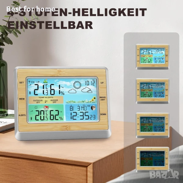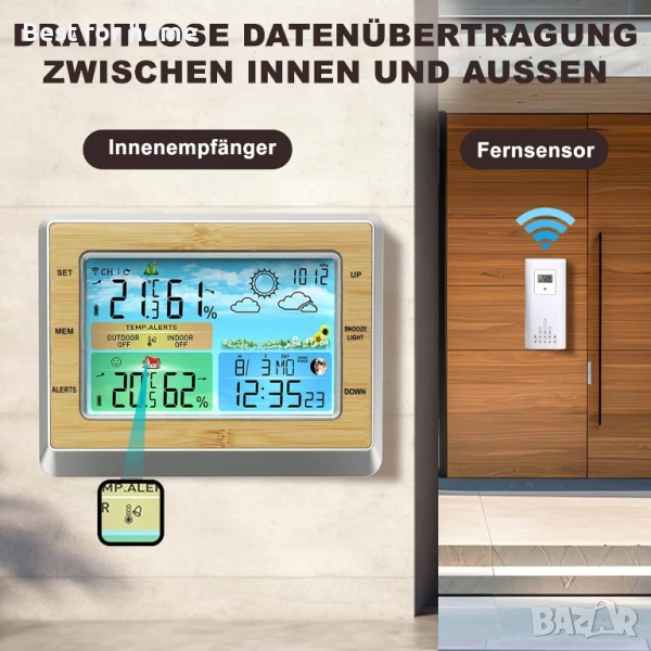 Функция радио и будилник: метеорологичната станция приема MSF радио сигнал за автоматично актуализиране на текущото време. Персонализиран будилник, който може да бъде настроен да звъни всеки ден или само през делничните/уикендните дни. Алармата за събуждане винаги ви помага да се отпуснете в точното време (функция за отлагане 5~60 минути).