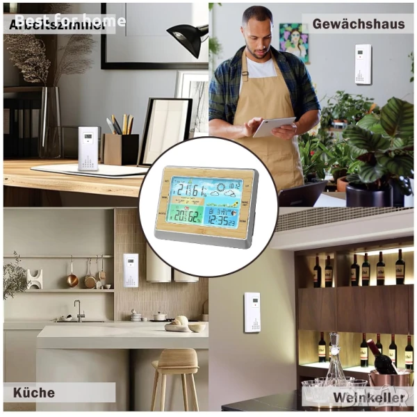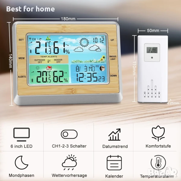 Подобрен дизайн: метеорологичната станция е с голям LCD дисплей: цветно осветеният дисплей на метеорологичната станция осигурява перфектен преглед на измерените стойности. Цялата важна информация за времето е видима с един поглед, като календар, будилник, налягане, температура и влажност или фази на луната и прогноза за времето. Забележка: При показване на фазата на луната, която се променя според календара, моля, уверете се, че метеорологичната станция е настроила правилната часова зона и дата.