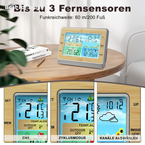 3-канален сензор за температура и влажност: цифровата метеорологична станция може да свърже до 3 безжични сензора. Дистанционните сензори предлагат обхват на предаване до 60 м, което означава, че можете да ги поставите в задния си двор, градината или вътрешния двор. Моля, обърнете внимание: включен е само 1 дистанционен сензор. За точни измервания на влажността, сензорът не трябва да бъде изложен на дъжд или пряка слънчева светлина.