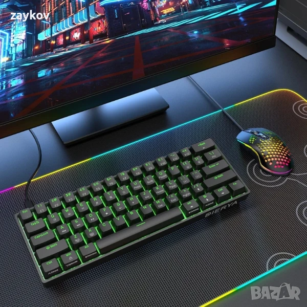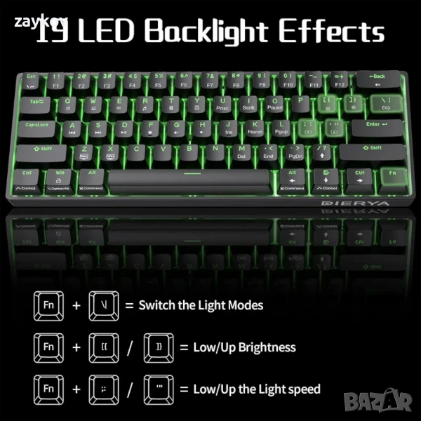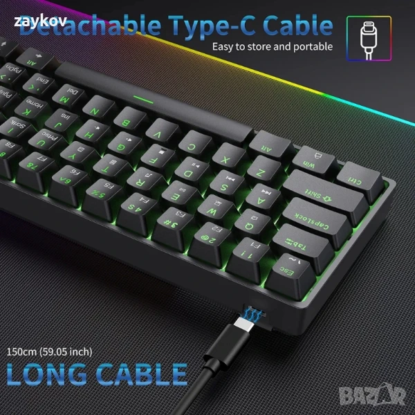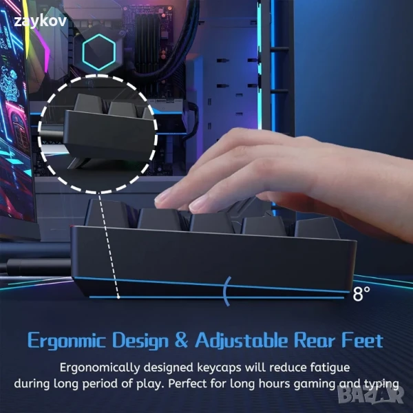 Минимализъм: DK61se е механична геймърска клавиатура с 61 клавиша, където всички функции се изпълняват чрез комбинацията от клавиши "FN". Ултракомпактната структура ви позволява да се възползвате максимално от пространството на бюрото и мишката.Монохромна леденосиня светлина: клавиатурата е оборудвана с 19 режима на осветление, натиснете "FN+|", за да промените режима на осветление, "FN+[{ ]}", за да регулирате яркостта на подсветката, "FN+;: '"", за да контролирате скоростта на осветление.Плавно гейминг изживяване: пълните бутони с анти-ghosting ви осигуряват по-плавно гейминг изживяване. Поддържа честота на анкетиране от 1000Hz, без латентност, плавно писане в играта.Ергономична клавиатура: дизайнът на тази механична геймърска клавиатура е базиран на ергономичност. Научно обмисленият дизайн на клавишите с стъпаловидно повдигане осигурява максимален комфорт, поддържа ръката ви в естествено състояние, за да се сведе до минимум умората след много години употреба. Перфектна за геймъри, офис служители, копирайтъри, учители по писане на машини и редактори.