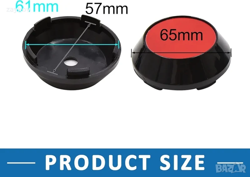 Размери на капачката на главината - Размери: 22 x 65 мм / 0.87 x 2.56 инча (В*Д); Диаметър на централния отвор: 9 мм/0.35"; Вътрешен диаметър от щипка до щипка: 57 мм/2.24"; Външен диаметър от щипка до щипка: 61 мм/2.4"