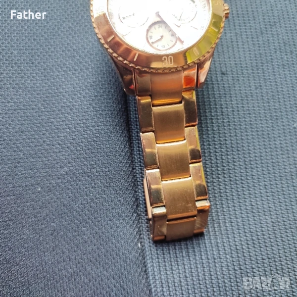 Часовника е почти нов. Не му е свалена още защитната лепенка на стъклото. Цвят розово злато. Работи безупречно.