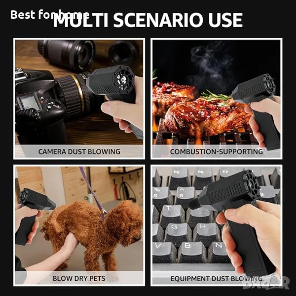 【Широка употреба】 Този продукт е практичен и може да се използва широко в различни сценарии, като почистване на външно оборудване, автомобили, компютри, клавиатури, камери, дивани, прозорци, растения и премахване на косми от домашни любимци. Може да се използва и като духалка за барбекю.