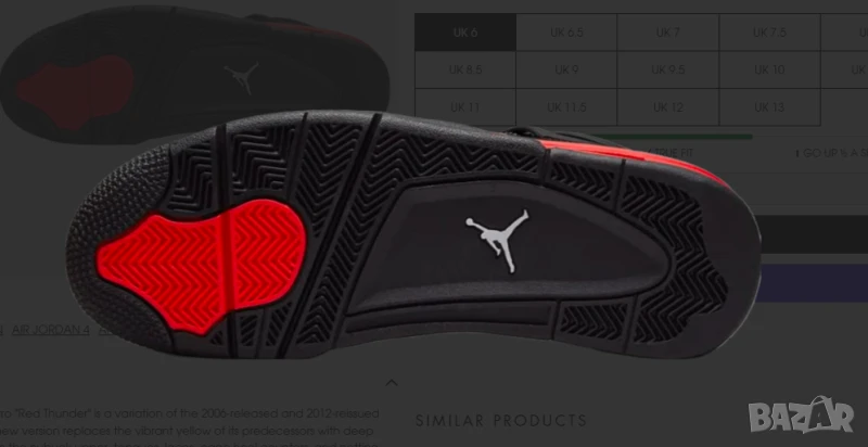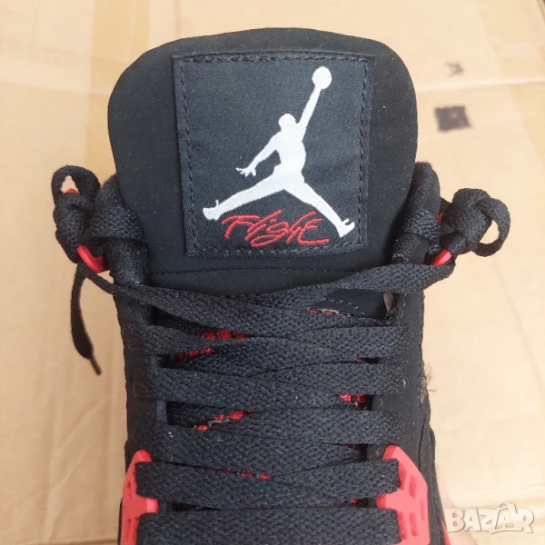 Air Jordan 4 Red Thunder се отличава с елегантна изцяло черна горна част от Durabuck, акцентирана от смели червени мрежести подложки и отвори за връзките. Класическата нашивка Air Jordan Flight е зашита на езика, добавяйки отличителен щрих. Впечатляваща червена междинна подметка се съчетава перфектно с езичето на петата Jumpman, засилвайки ретро излъчването на маратонката. Този дизайн съчетава модерни материали с емблематични елементи, което я прави стилен избор както за ежедневно носене, така и за специални поводи.