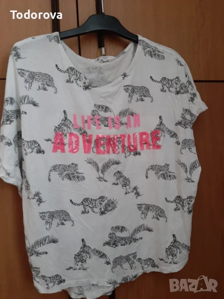 1. Бяла Блуза с кимоно ръкав H & M - razmer M - 7 лв от Австрия с тигри и надпис Life is an Adventure НОВА