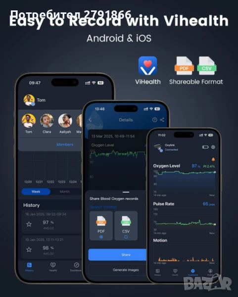 - БЕЗПЛАТНО ПРИЛОЖЕНИЕ ЗА iOS И ANDROID: Неограничено място за съхранение в приложението Vihealth, преглед на кръвния O2 и пулса в реално време в таблото за управление на приложението. Свържете устройството с приложението чрез Bluetooth.
