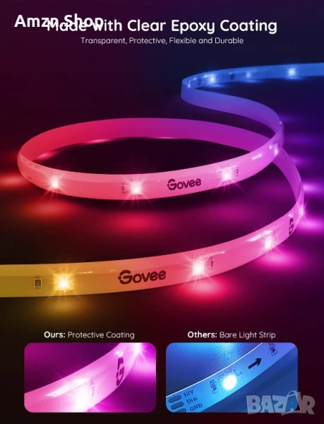 Защитно покритие: LED лентите Govee са покрити със защитно покритие, което е изключително издръжливо и гъвкаво. То може да предпази интелигентните LED ленти от влага и прах и да покаже цветни светлинни ефекти.