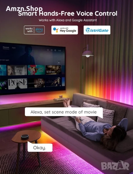 Alexa LED светлини: Свържете интелигентни LED ленти директно към вашия WiFi рутер, като Alexa/Google Assistant ви осигуряват подобрено гласово управление. Само с една проста гласова команда, за да създадете мечтания си светлинен свят.
