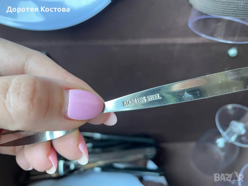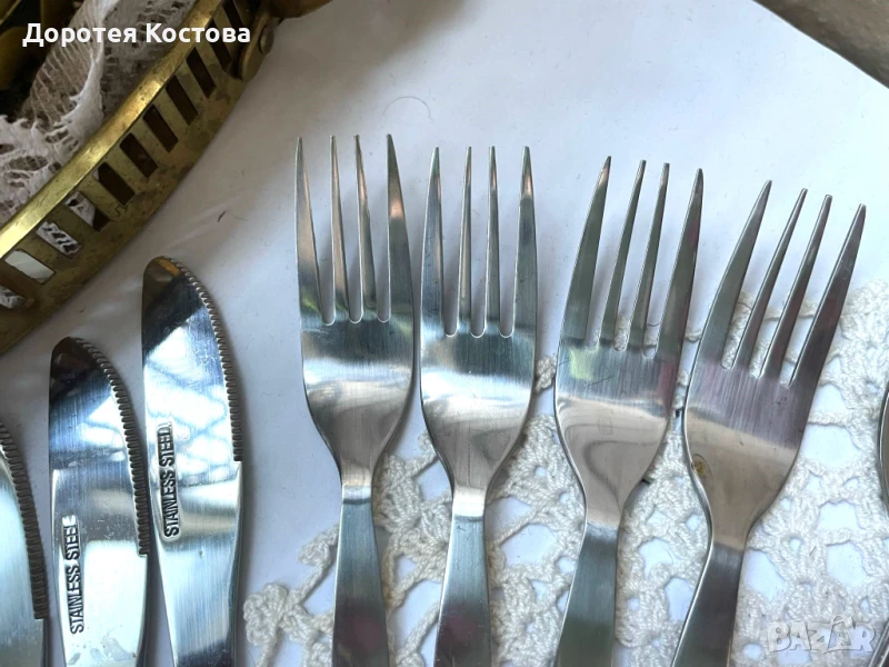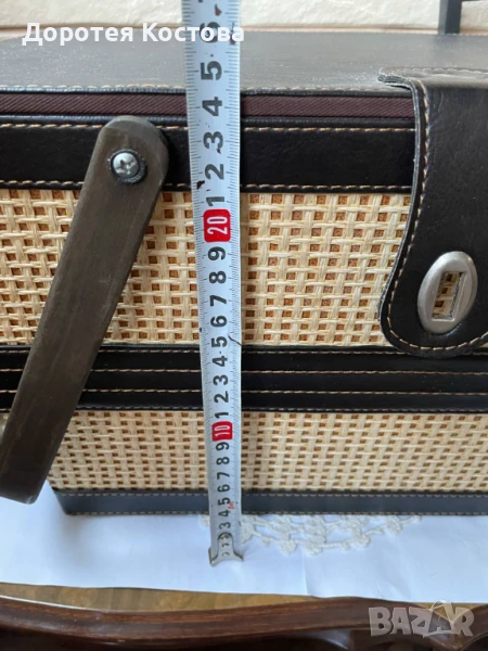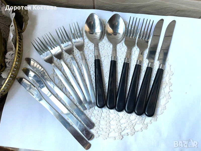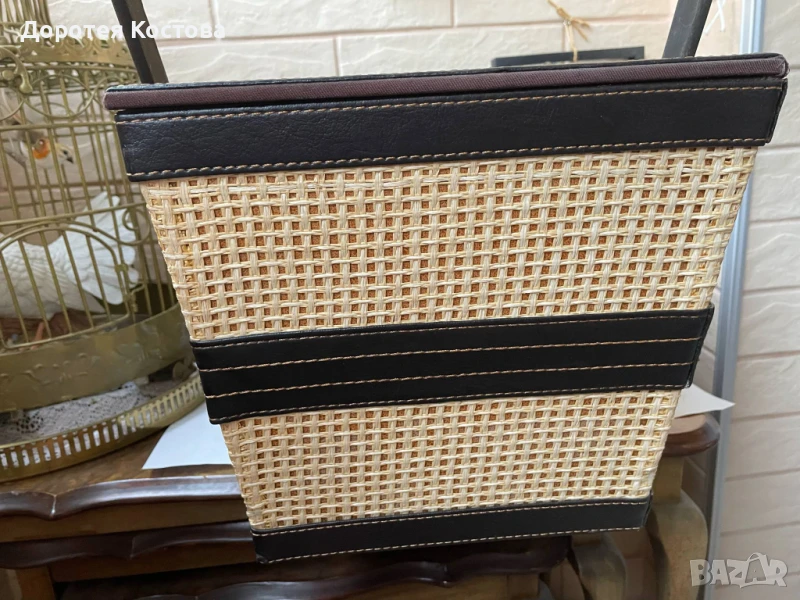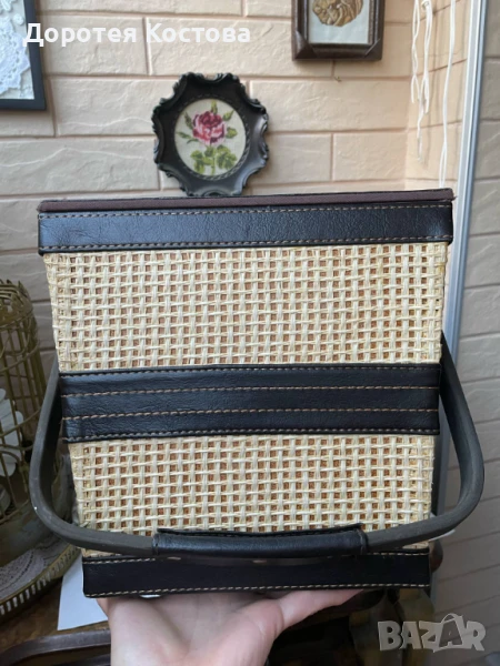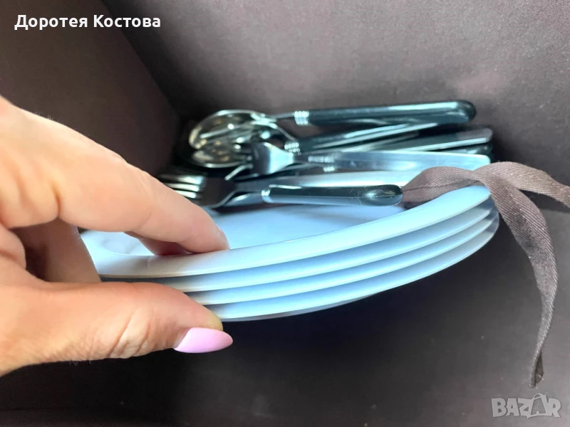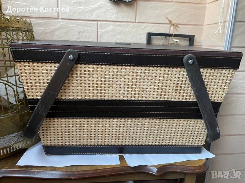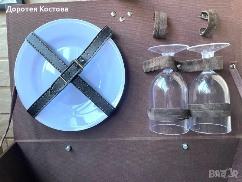 Красива кошница за пикник от Англия с пластмасови чаши и чинии + прибори от неръждаема стомана. Размерите са на снимките, в много добро състояние, една малка забележка / последната снимка /. Цена - 70 лв.