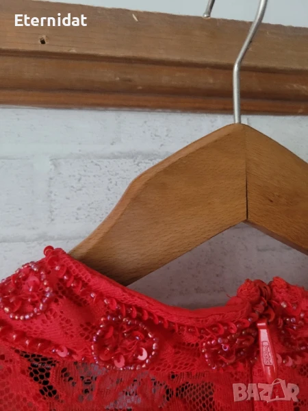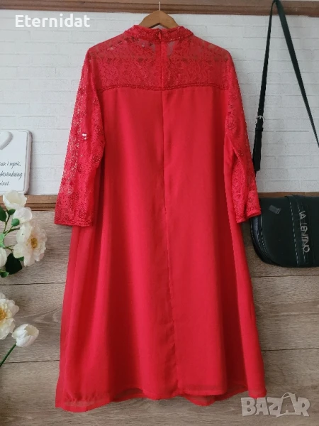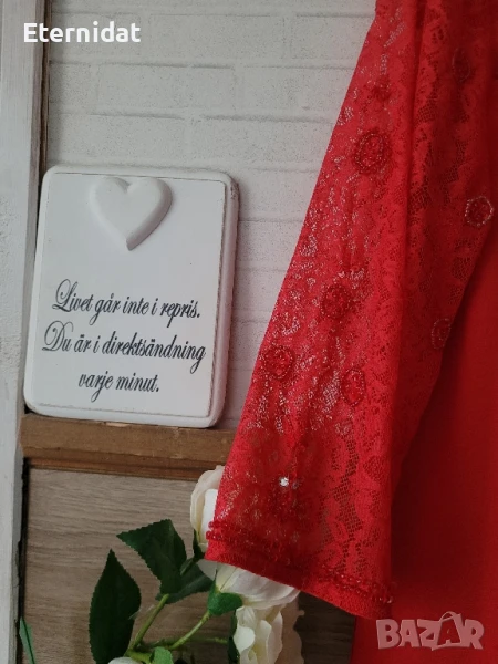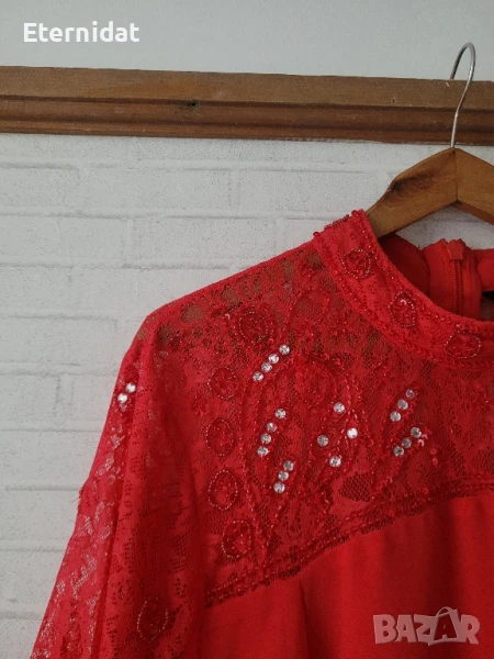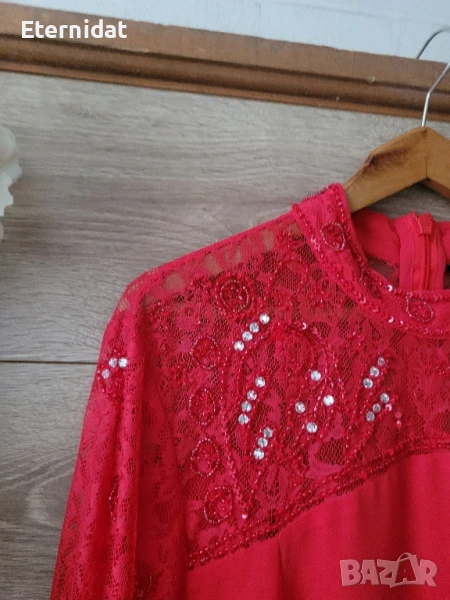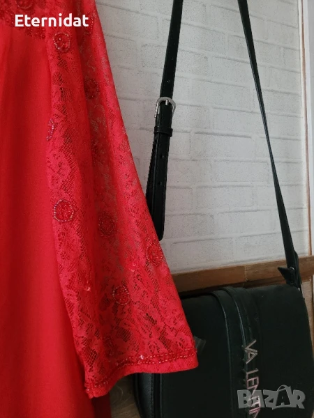 Официална червена рокля на бранда DOROTHY PERKINS. Горната част и ръкавите са от дантела, която е ръчо бродирана с перли и камъчета. Отзад е със скрито закопчаване цип. Допълнителна подплата. Размер ХЛ. Дълга 97см, гръдна до 112см .Цена 55лв