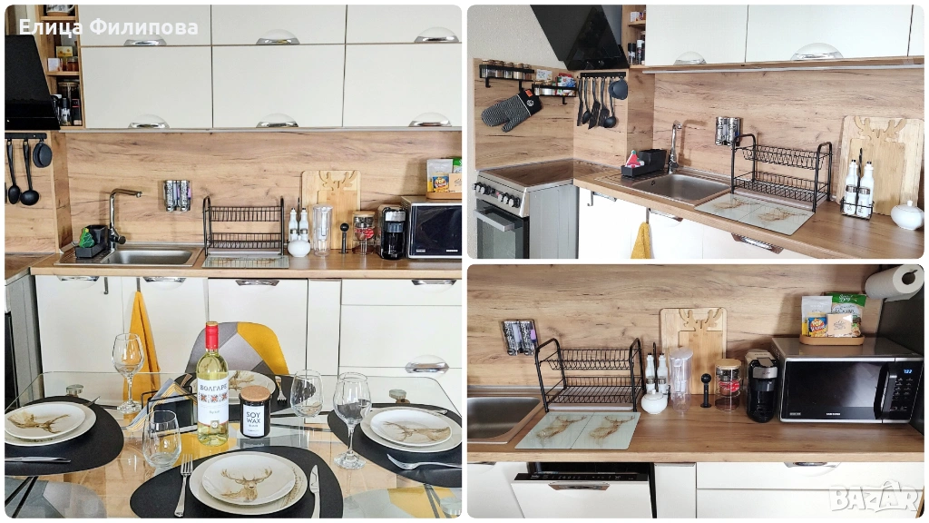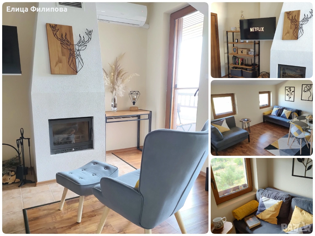 - хол с напълно оборудвана кухня (голям хладилник, печка с котлони, миялна, микровълнова, кафе машина, еарфрайер и т.н.), трапезна маса, два разтегателни дивана (единичен и двоен), камина на дърва, климатик, smart телевизор с Netflix