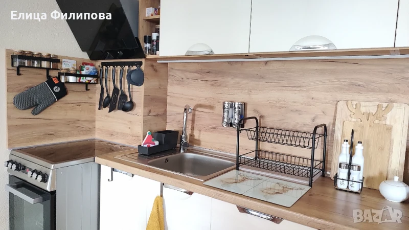 - хол с напълно оборудвана кухня (голям хладилник, печка с котлони, миялна, микровълнова, кафе машина, еарфрайер и т.н.), трапезна маса, два разтегателни дивана (единичен и двоен), камина на дърва, климатик, smart телевизор с Netflix