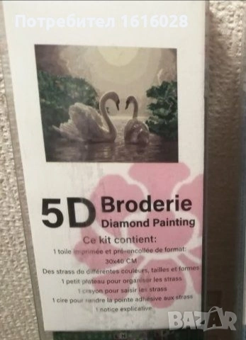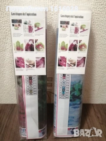 Различни модели диамантени Гоблени.Цялостно облепване с кръгли камъчета. Във всеки комплект се съдържа по 1 отпечатано платно,стрази с различни цветове,1 малък поднос за подреждане на диаманчетата, 1 молив за хващане на диаманчетата,1 восък.Диамантчета се подреждат на определените места,като се следват буквите,знаците,цифрите и цветовете отговарящи на тях.