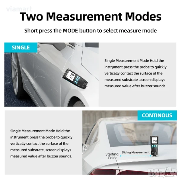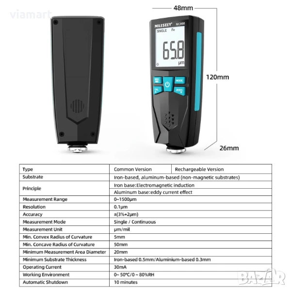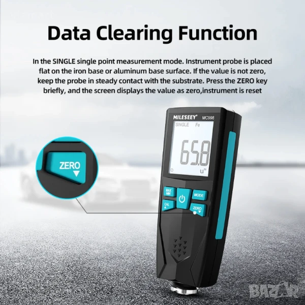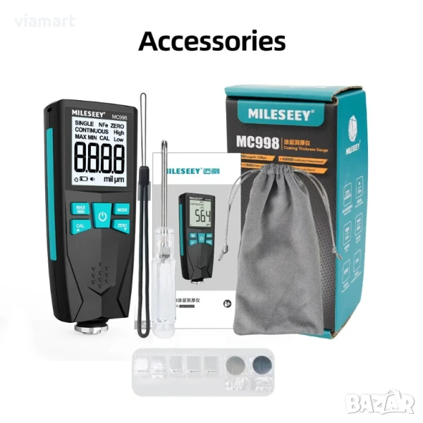 Дебеломер за боя Mileseey MC998 - професионален уред, създаден за точно и бързо измерване на дебелината на боя, лак и други покрития върху желязо, стомана, алуминий и други метални повърхности. Устройството е изключително полезно при проверка на автомобили преди покупка, за установяване на пребоядисани зони, наличие на шпакловки или нерегламентирани ремонти.