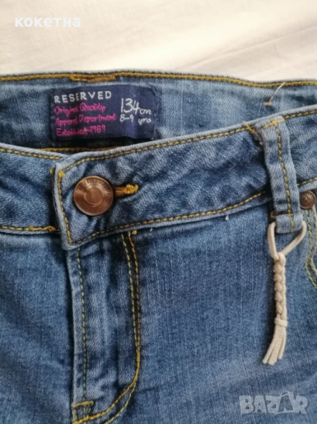 Дънки RESERVED по етикет за 8-9г р.134см, дължина на крачола 80см, талия 32см, но е с ластик и копчета за коригиране, ханш 39см. Еластични са.