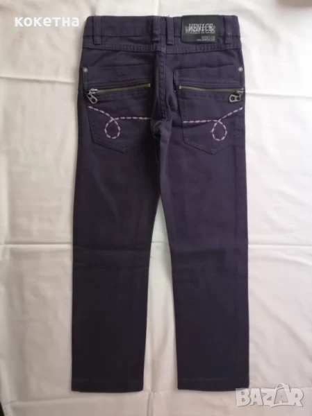 Тъмно лилав панталон тип дънки wenice по етикет за 7г р.122см, дължина на крачола 73см, талия 30см, но е с ластик и копчета за коригиране, ханш 36см.