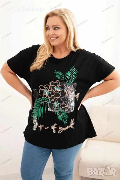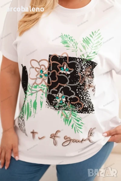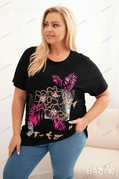 Дамска памучна тениска с декоративен флорален принт, Големи размери, 7цвята