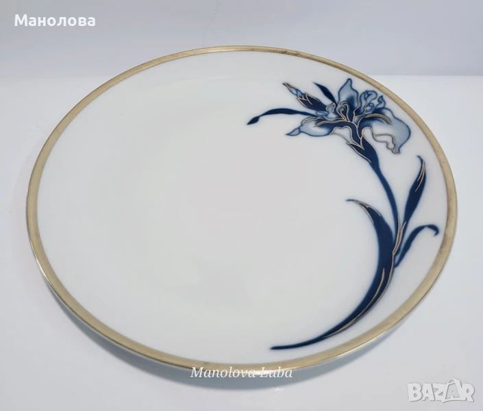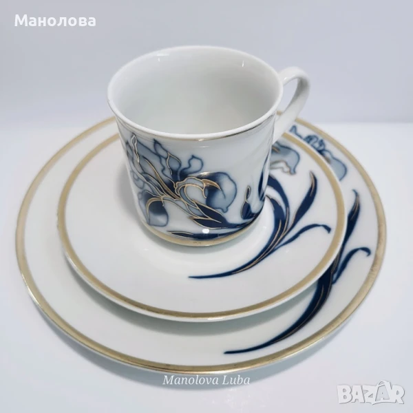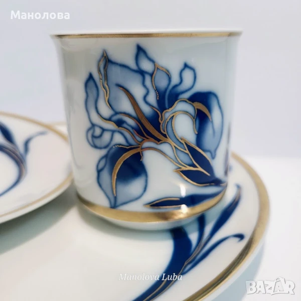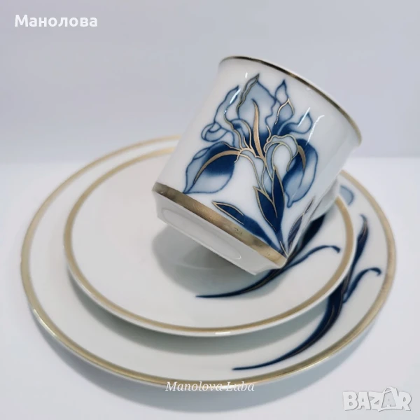 Изработени от фин порцелан с под глазурна синя рисунка на ирис и над глазурна позлата от 24каратово злато. Маркировките на дъното показват, че тези части са направени през 60те години на миналия век. Нямат чипове и наранявания.