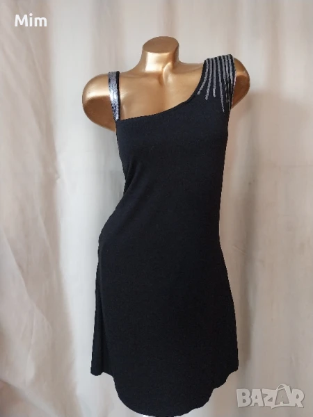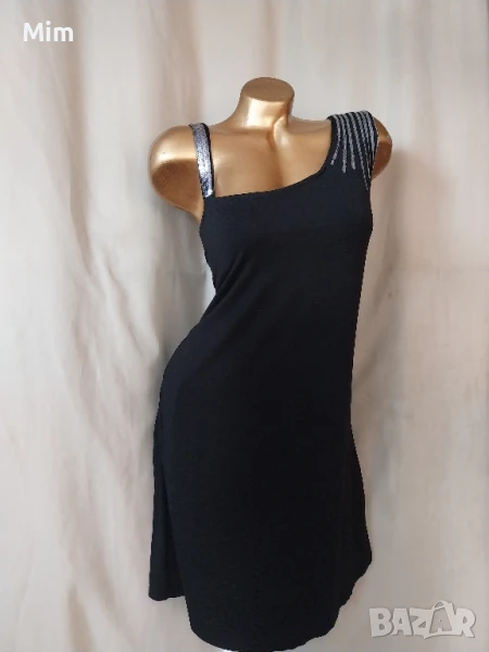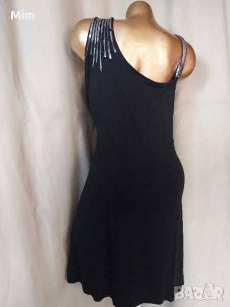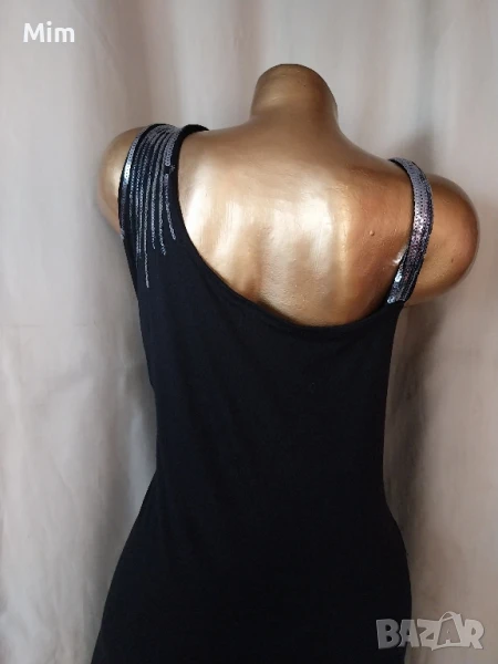Черна семпла рокля от меко трико ,на презрамките с зашити сребристи пайети ,гръдна от 60 до 75 см едностранно, талия от 55 до 70 см едностранно, ханш от 6о до 75 см едностранно, дължина 92. см Няма забележки