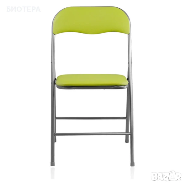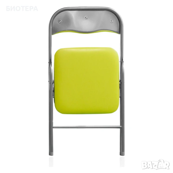 Ново — сгъваем комфортен стол PARIS в приятен зелен цвят. Метална конструкция и тапицерия от еко кожа, компактни размери 44×45×78 cm — идеален за допълнителни места в кухня, балкон, градина или гостна.