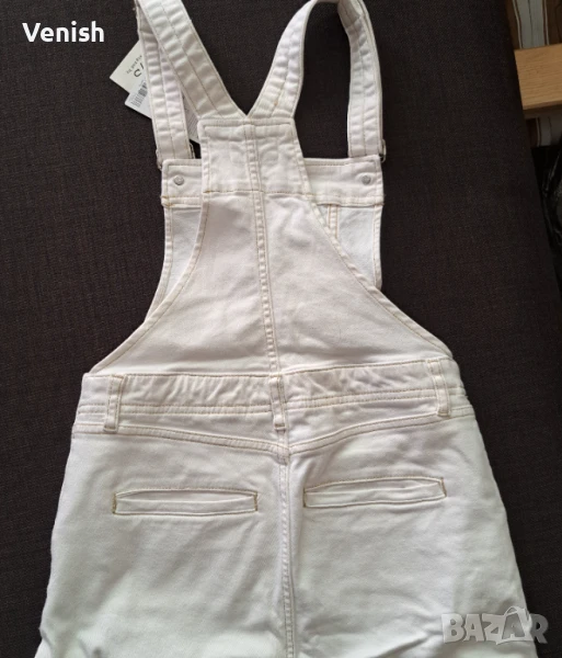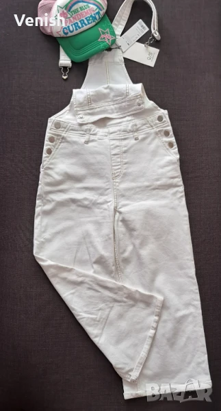 Страхотен бял гащеризон от плътен дънков плат, купих го за дъщеря михза 59 лв., но е малък. За момиче 10-14 г.Дължина на крачола от талията до долу 80 см. Шапката е също OVS, не е носена, но без етикети.