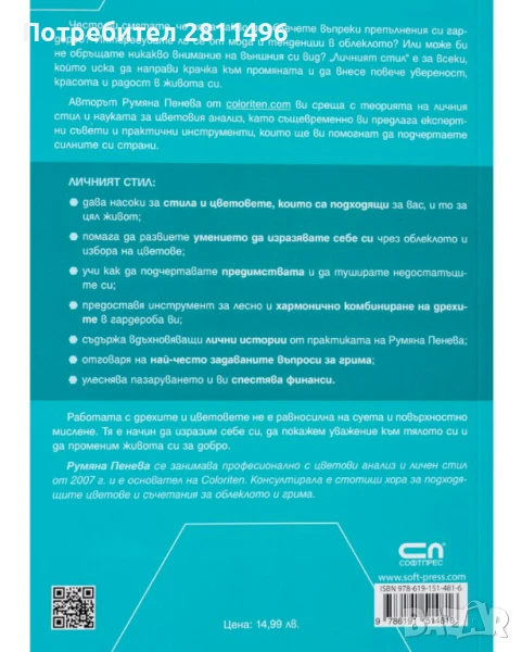 Авторът Румяна Пенева ви среща с теорията на личния стил и науката за цветовия анализ, като същевременно ви предлага експертни съвети и практични инструменти, които ще ви помогнат да подчертаете силните си страни. Личният стил: