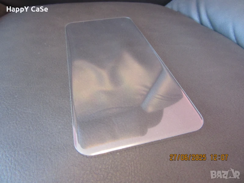 5. Махнете предпазното фолио от долната страна на стъкления протекторпротектор и го равнете прецизно спрямо екрана на телефона. Особено ВАЖНО е при всички заоблени екрани (респективно протектори) е протектора да се центрира добре наляво надясно по широчината на екрана за да могат заоблените ръбове на протектора да легнат точно върху заоблените ръбове на екрана. Ако това не се направи и протектора бъде изместен наляво или надясно спрямо централната ос на екрана, ще се отлепи бързо от срещуположната страна на изместването, защото заоблената част на протектора се качва върху правата част на екрана.