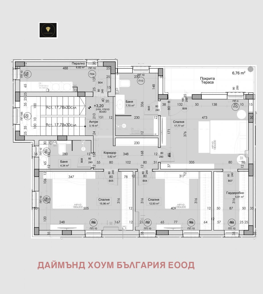 3 спални, 2 бани с wc, гардеробна, перално, тераса.