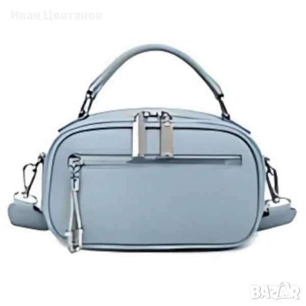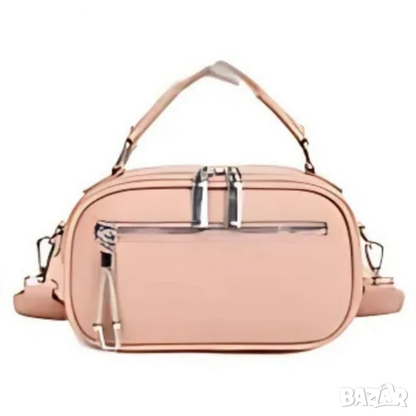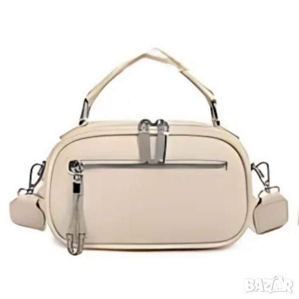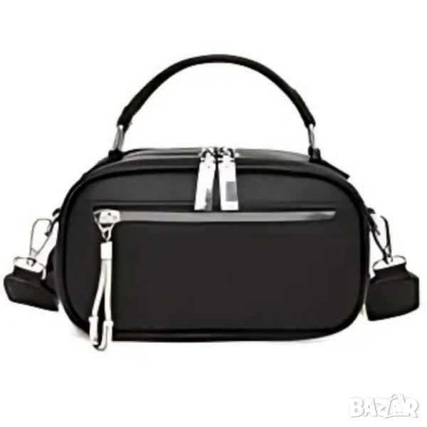 Материал: Еко к о ж а;Размери: 21 см (ширина) х 11 см (височина) х 7 см (дълбочина);Цвят: Бежов, сив, кафяв, черен, син, светло бежов, бял, розов, зелен, лилав;Закопчаване: Основен цип, преден джоб с цип;Дръжки: Къса дръжка и регулируема дълга презрамка.