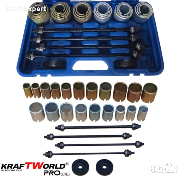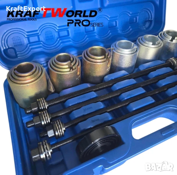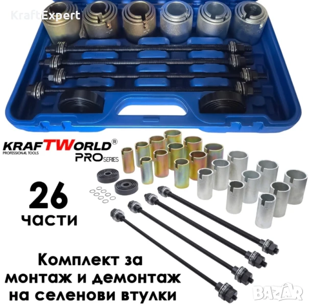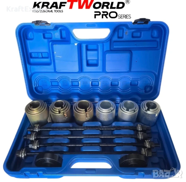 ✅ Комплект от 26 части за монтаж и демонтаж на втулки и лагери✅ 4 болта с резба: M10xP1.5, M12xP1.75, M14xP2.0, M16xP2.0✅ 2 адаптера с различни размери✅ Втулки за избиване – златисти и сребристи✅ Подходящ за професионална и любителска употреба🔧 Професионален универсален комплект за монтаж и демонтаж на селенови втулки, лагери и семеринги – KraftWorld ProТози комплект от 26 части е създаден за лесен и ефективен монтаж и демонтаж на селенови втулки, лагери, семеринги и други компоненти. Подходящ е както за професионални автосервизи, така и за домашни майстори, които търсят надеждно и универсално решение.Комплектът включва:4 броя болтове с резба:M10xP1.5M12xP1.75M14xP2.0M16xP2.0Дължина на болтовете: 470 мм2 броя адаптери:Адаптер 1: Ø42-48, Ø54-60Адаптер 2: Ø36-42, Ø48-54, Ø60-66Втулки за избиване – златисти:44xØ3446xØ3654xØ4456xØ4658xØ4866xØ5668xØ5870xØ6078xØ6880xØ7084xØ72Втулки за избиване – сребристи:48xØ3850xØ4052xØ4260xØ5062xØ5264xØ5472xØ6274xØ6476xØ66Предимства:✅ Универсалност: Подходящ за различни размери втулки и лагери✅ Здравина: Висококачествени материали за дълготрайна употреба✅ Лесен за използване: Интуитивен дизайн за бърз и ефективен монтаж/демонтаж✅ Компактност: Всички части са подредени в удобен куфар за лесно съхранение и пренасянеС този комплект ще спестите време и усилия при работа с различни видове втулки и лагери. Незаменим помощник за всеки автосервиз или домашен гараж.