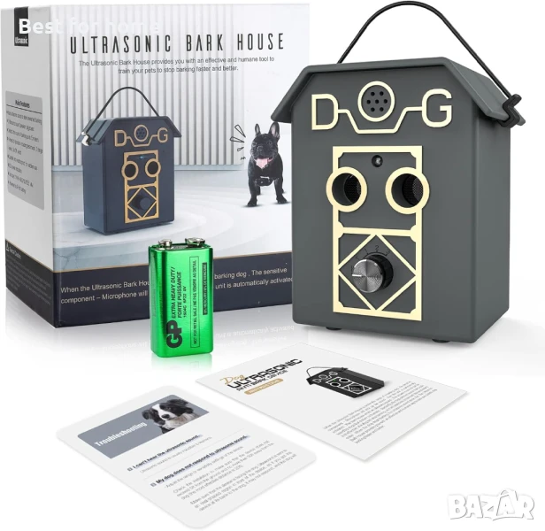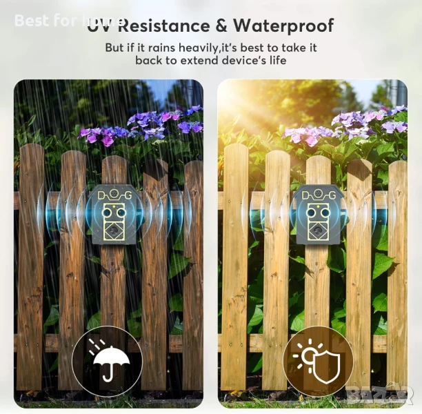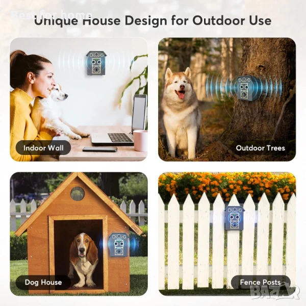 【Издръжлива и устойчива на атмосферни влияния кутия против лай】Устройството против лай се предлага с добре проектирана форма на къщичка, която е лесна за окачване на дървета, стени или стълбове на огради. Нашето устройство против лай може да работи дори във ветровити и дъждовни дни. Но е най-добре да не оставяте отделението за батерии в долната част на устройството против лай да се накисва във вода, в противен случай това ще повреди устройствата за контрол на лая на кучета. В сравнение с традиционното устройство за обучение на кучета, то напълно освобождава ръцете ви (ако е на закрито, препоръчваме чувствителността да е 1).