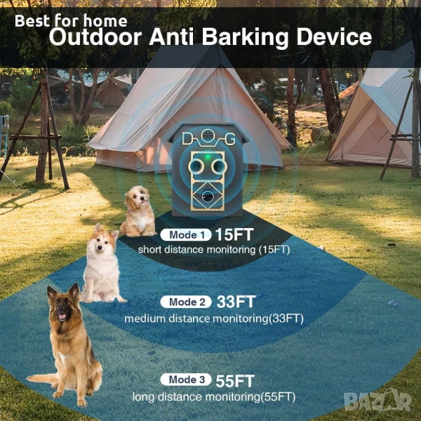 Обхват на устройството за възпиране на кучешки лай до 15 метрНисък обхват - до 4,5 метра (препоръчва се тестване на закрито).