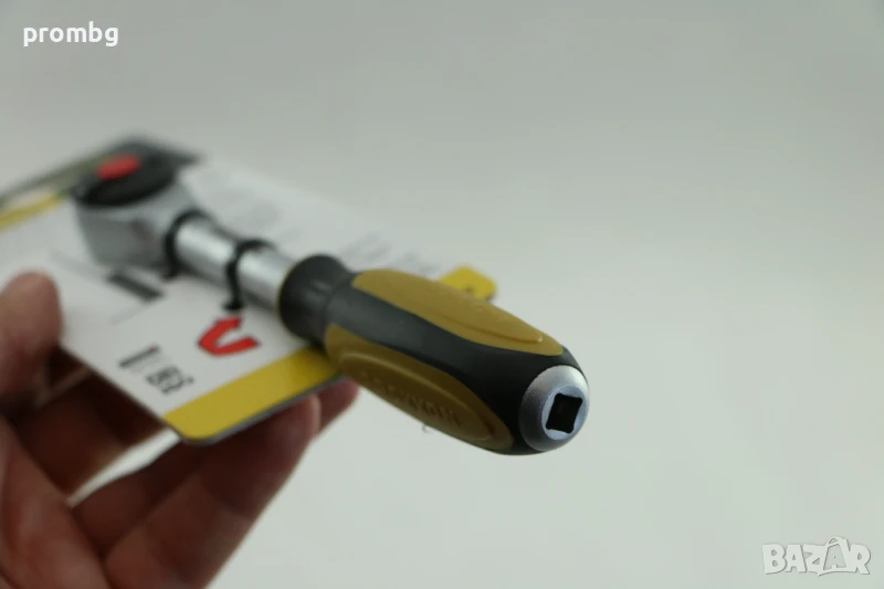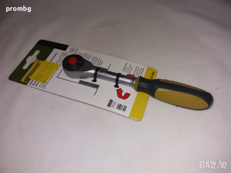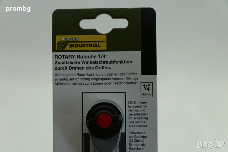 PROXXON ротационна тресчотка 1/4 инча, Германия. Присъединителен квадрат: 1/4. Тресчотъчен механизъм: 52 зъба, реверс, заключващ бутон. Дръжката е снабдена с присъединителен отвор 1/4“ на който може да се постави и Т- дръжка. По предписание на производителя МАКСИМАЛНОТО УСИЛИЕ при използването на Т-дръжка ДА НЕ НАДВИШАВА 12,5Nm=1.25Kg/m