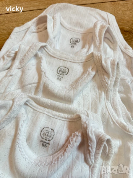 Комплект от 3 класически бели бебешки бодита без ръкави. Изработени от мек и дишащ органичен памук с деликатен десен на сърчица. Идеални за летните месеци или за носене под други дрешки през по-прохладни дни. Размер 86.