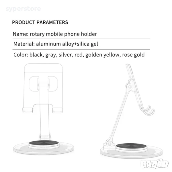 Универсална стойка за телефон подходяща за всички видове мобилни телефони, смартфони, с омекотени зони на захват, предпазващи устройството Ви.Сгъваема преносима стойка за телефон с регулируема посоката по хоризонтал на 360 гр., регулиране вертикалния наклон на 90гр, и дизайн против хлъзгане, гумирани подложки против преплъзване.