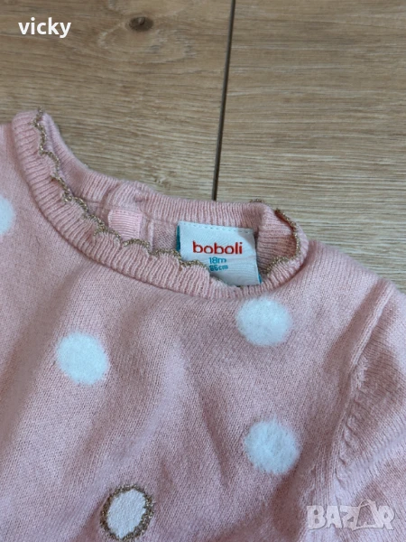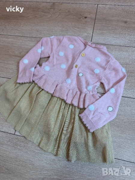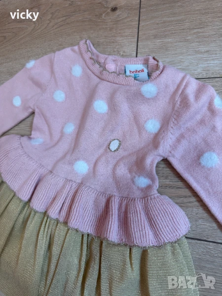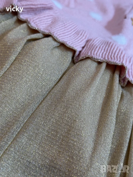 Приказна блестяща рокличка в нежно розово и златна долна част на бранда Boboli. Размер 18М, 86см. Изключително приятна на допир материя, със златна нишка и пухкави бели точки. Тюлът има подплата. Рокличката е истинско бижу! Обличана е само и единствено веднъж, за фотосесия, за няколко минутки. Без забележки, като нова! Затова и посочвам това състояние в описанието! Изпрана и дезинфекцирана.