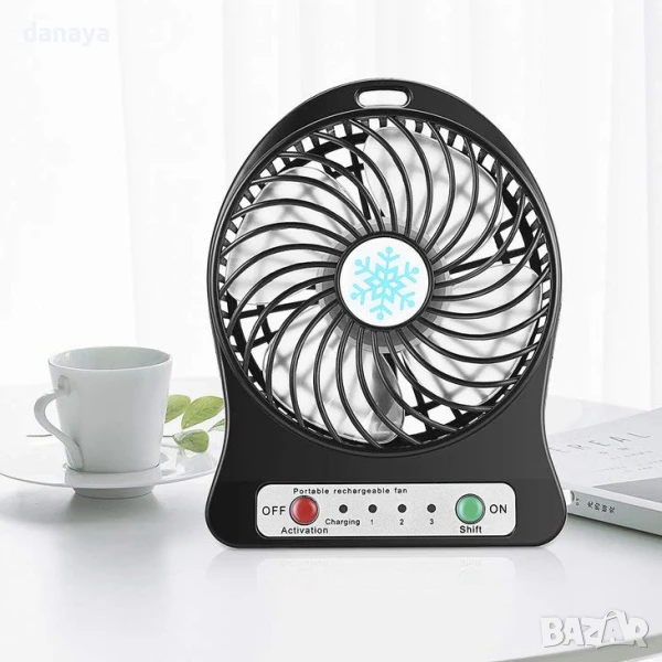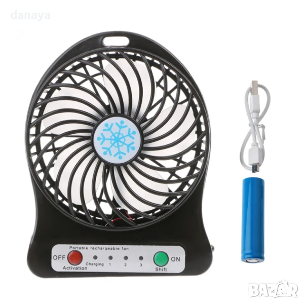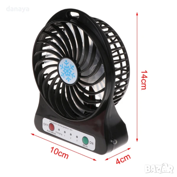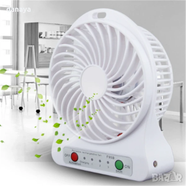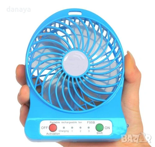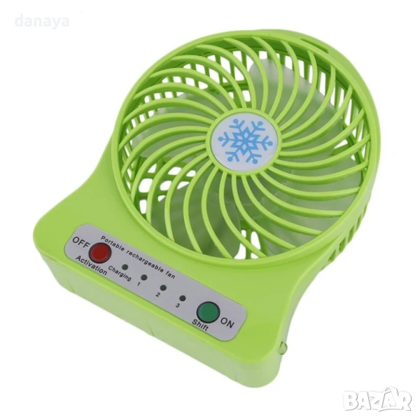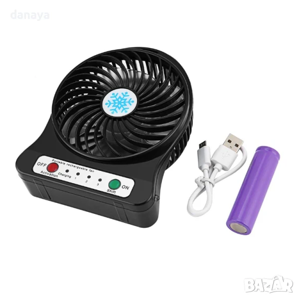 Портативен мини вентилатор с USB зареждане. Може да се ползва като вентилатор за бюро, вентилатор за къмпинг, вентилатор за кола и навсякъде другаде, тъй като това е преносим мини вентилатор. Аксесоар за разхлаждане в горещите летни дни. Предлага се в 4 цвята – черен, бял, зелен и лилав. Зарежда се с USB кабел, включен в комплекта.