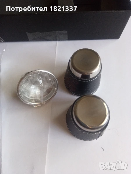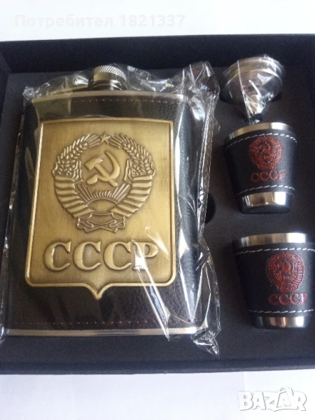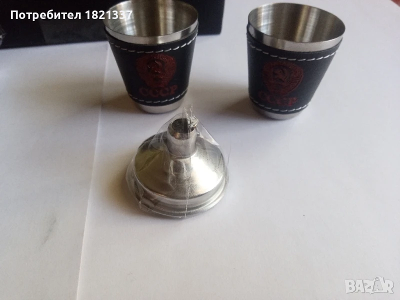 Манерка с две чаши. С фуния и оригинална кутия. Размери на манерката височина 13,8 см, дължина 9,5 см и ширина 2,2 см. Две чаши. Размери: височина 4 см, диаметър 3,7 см, диаметър на дъното 2,2 см. Фуния с размери: диаметър 3,5 см и височина 2,7 см. Размери на кутията: 18,5 см на 16,5 см.