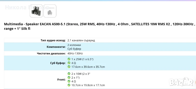 Суб буфер : 1 x 25W (1 x 6.5") 4 Ω 17.6cm x 39.6cm x 35.7cm