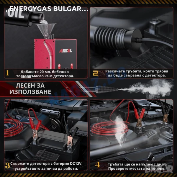 БЕЗОПАСНО И УСЪВЪРШЕНСТВАНО: Машината за дим ANCEL S160 е безопасна и надеждна, без да се налага автомобилът да бъде стартирван по време на употреба. Димът е безвреден. Защита от прегряване и защита от замръзване – когато температурната граница от 90 ° C бъде надвишена, интелигентното захранване ще се изключи автоматично. Уредът може да работи безпроблемно дори и при -20 ° C.