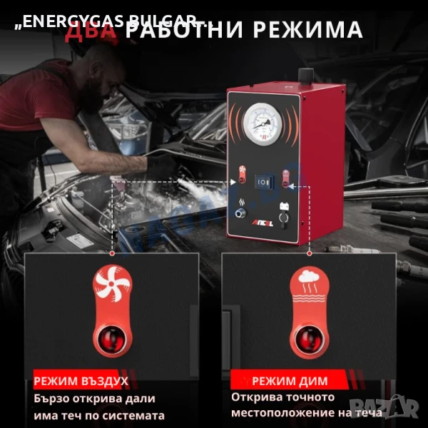 -ДВОЕН РЕЖИМ НА РАБОТА – С режим за въздух и режим за дим, той осигурява несравнима гъвкавост при диагностициране на течове. Режимът за въздух бързо идентифицира потенциални течове, докато режимът за дим се фокусира върху точното им местоположение. Тази двойна функционалност ускорява откриването на течове с до 50%, намалявайки времето за диагностика и разхода на димно масло.