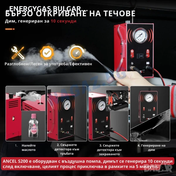 ANCEL S200 е машина за дим с вградена въздушна помпа и манометър, което прави лесно засичането на течове. Когато има теч в емисионната система или вакуумната система на автомобила, това ще доведе до лошо ускорение, липса на мощност, лош разход на гориво, несъответствие на емисиите на отработени газове, треперене на двигателя, включена предупредителна светлина и др. Димогенераторът може да ви помогне да локализирате и отстраните течове от превозното средство като осигурява нормалната работа на автомобилите, намалявайки времето и разходите за поддръжка.